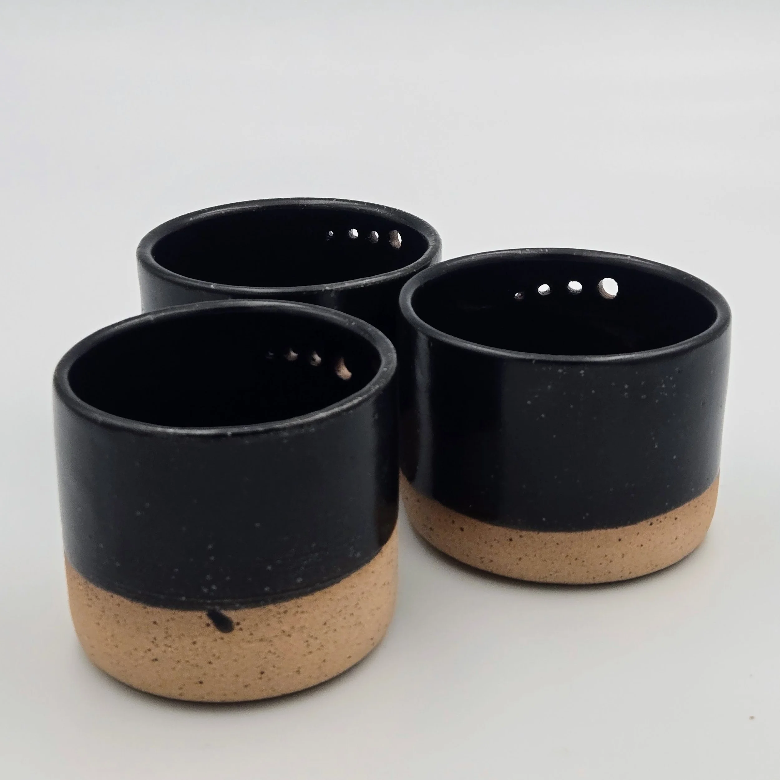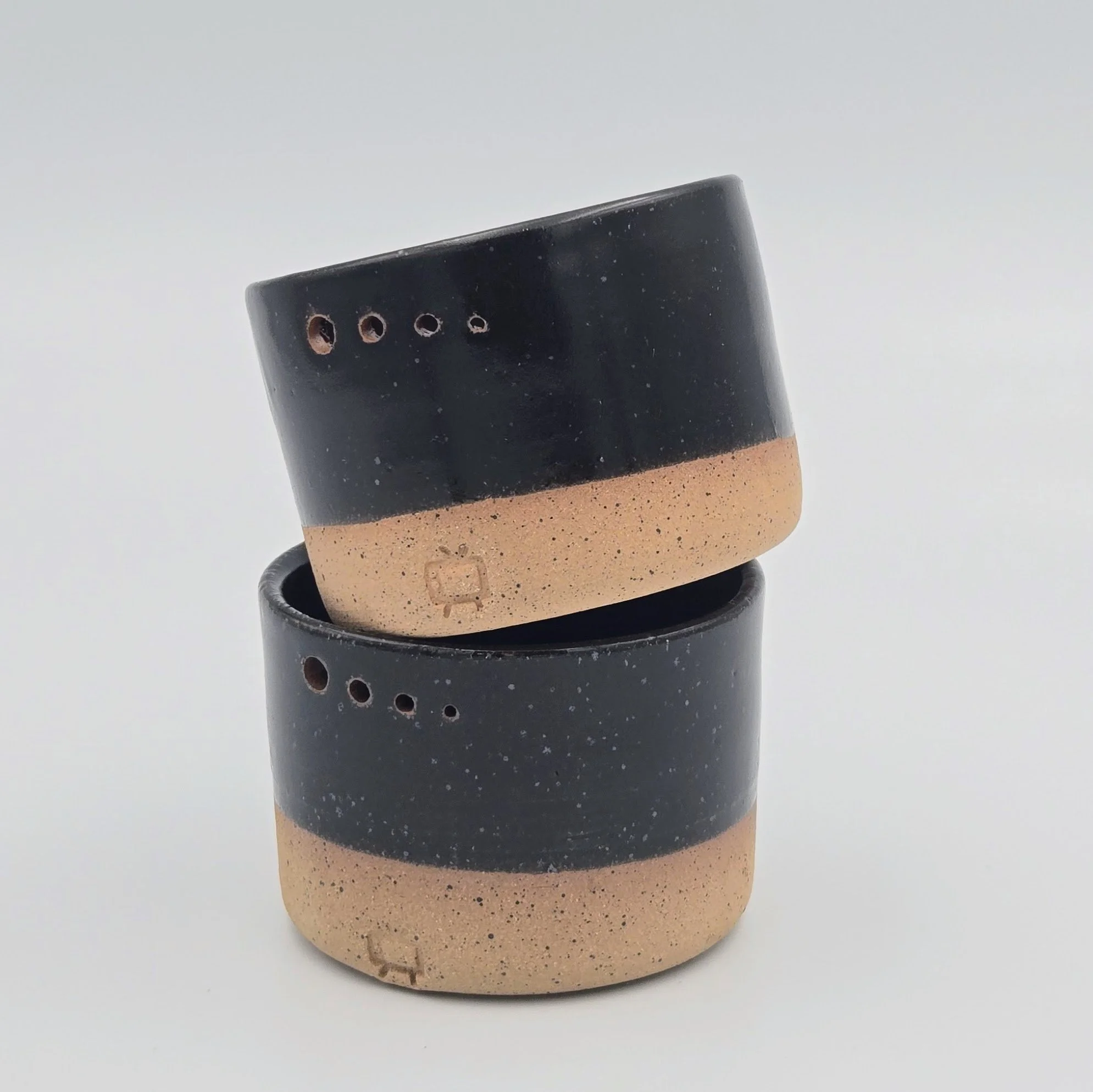 Wheel-thrown herb stripper with multiple hole sizes for stripping fresh herbs. Indigo glaze with exposed clay base.