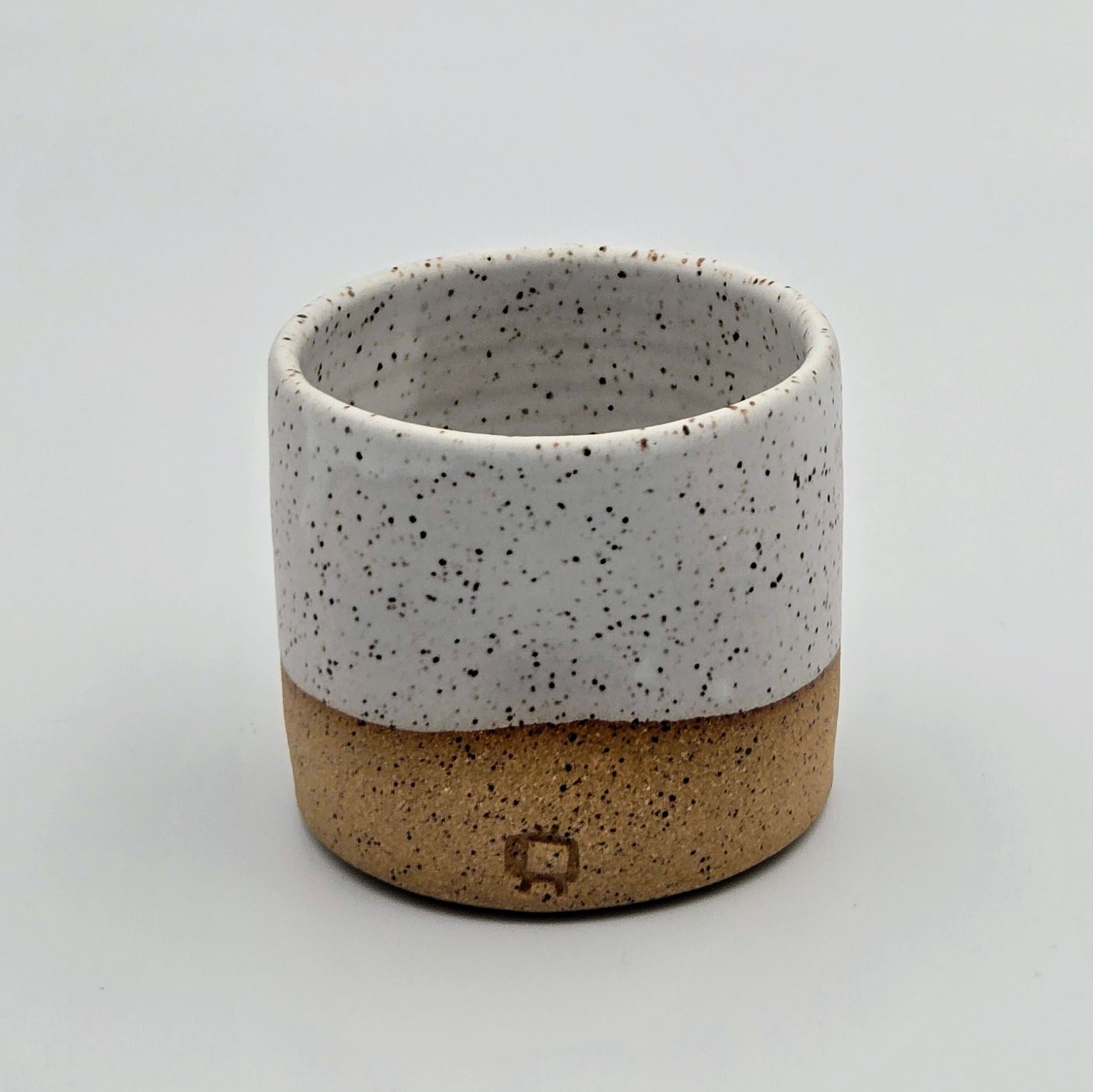 Wheel-thrown rocks cup. Moss glaze with exposed clay base. Stackable. Approximately 3" diameter x 2.5" tall. Holds approximately 8oz.