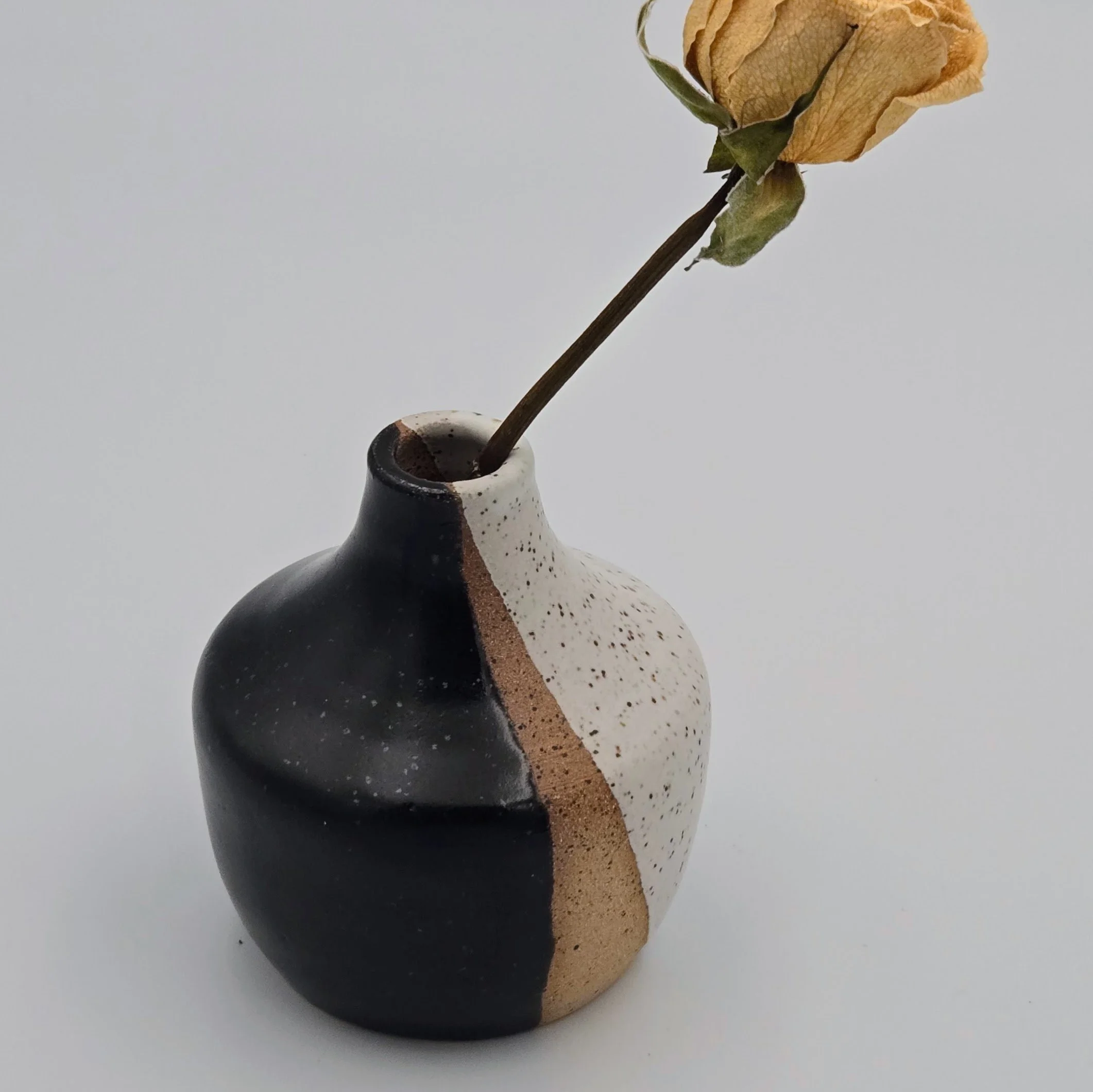 Wheel-thrown bud vase. Obsidian glaze with exposed clay base. Approximately 2.5-3" diameter x 3-4" tall. One of a kind.