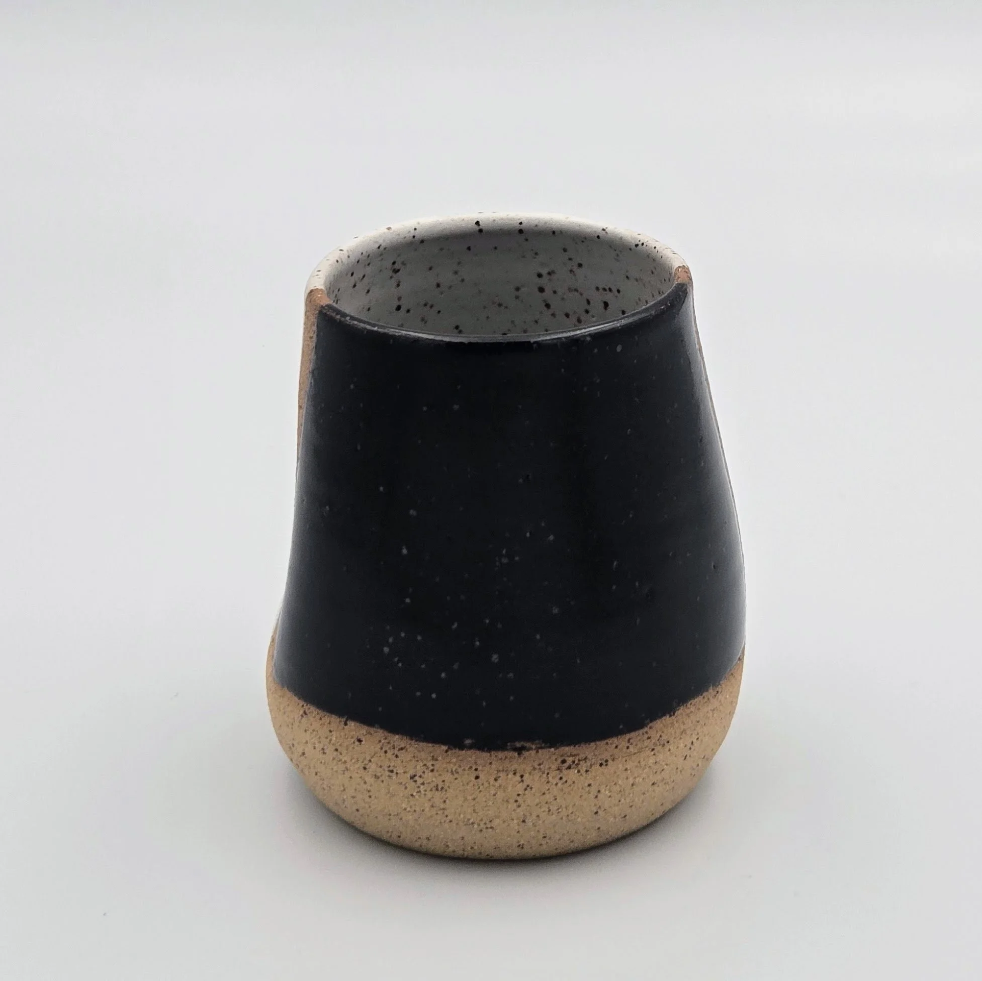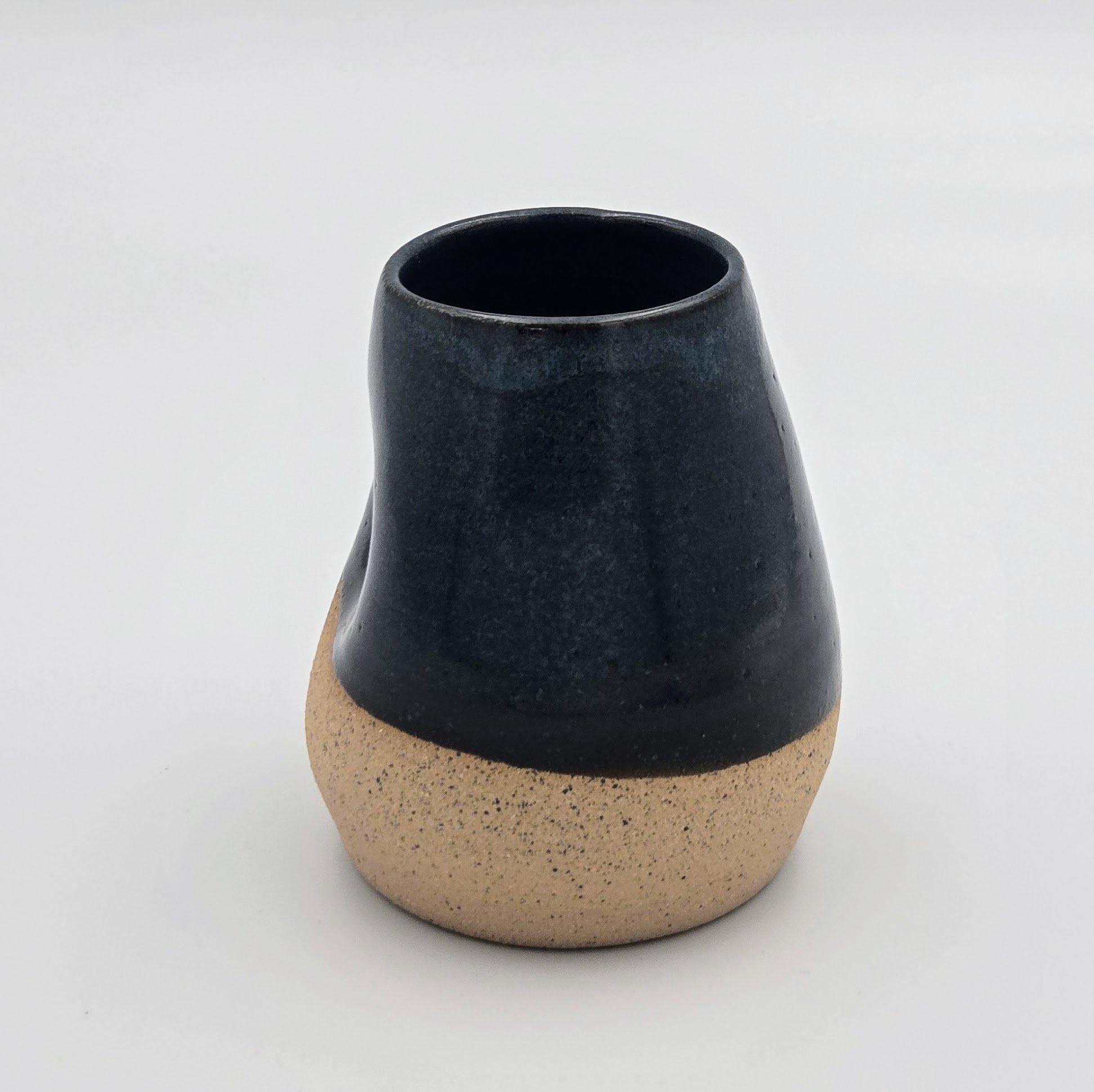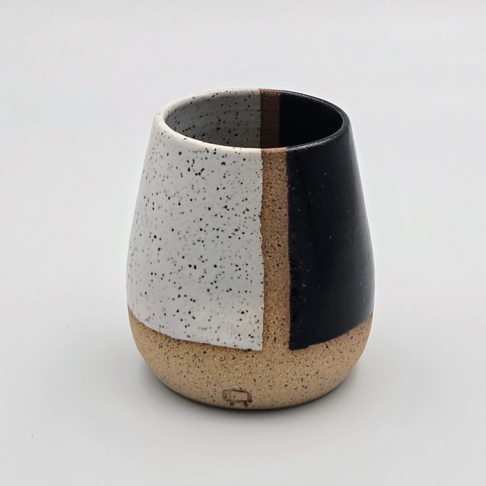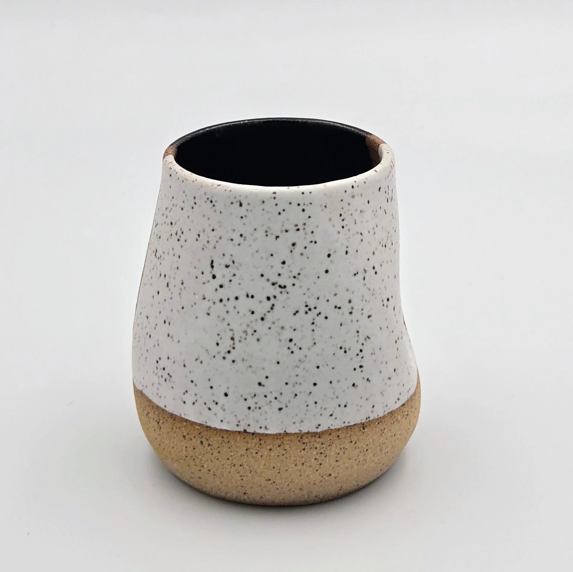 Stemless wine cup with thumbprint indent for grip. Saltstone glaze with exposed clay base. Holds 16oz - more than your standard pour. Approximately 3" diameter x 4" tall.