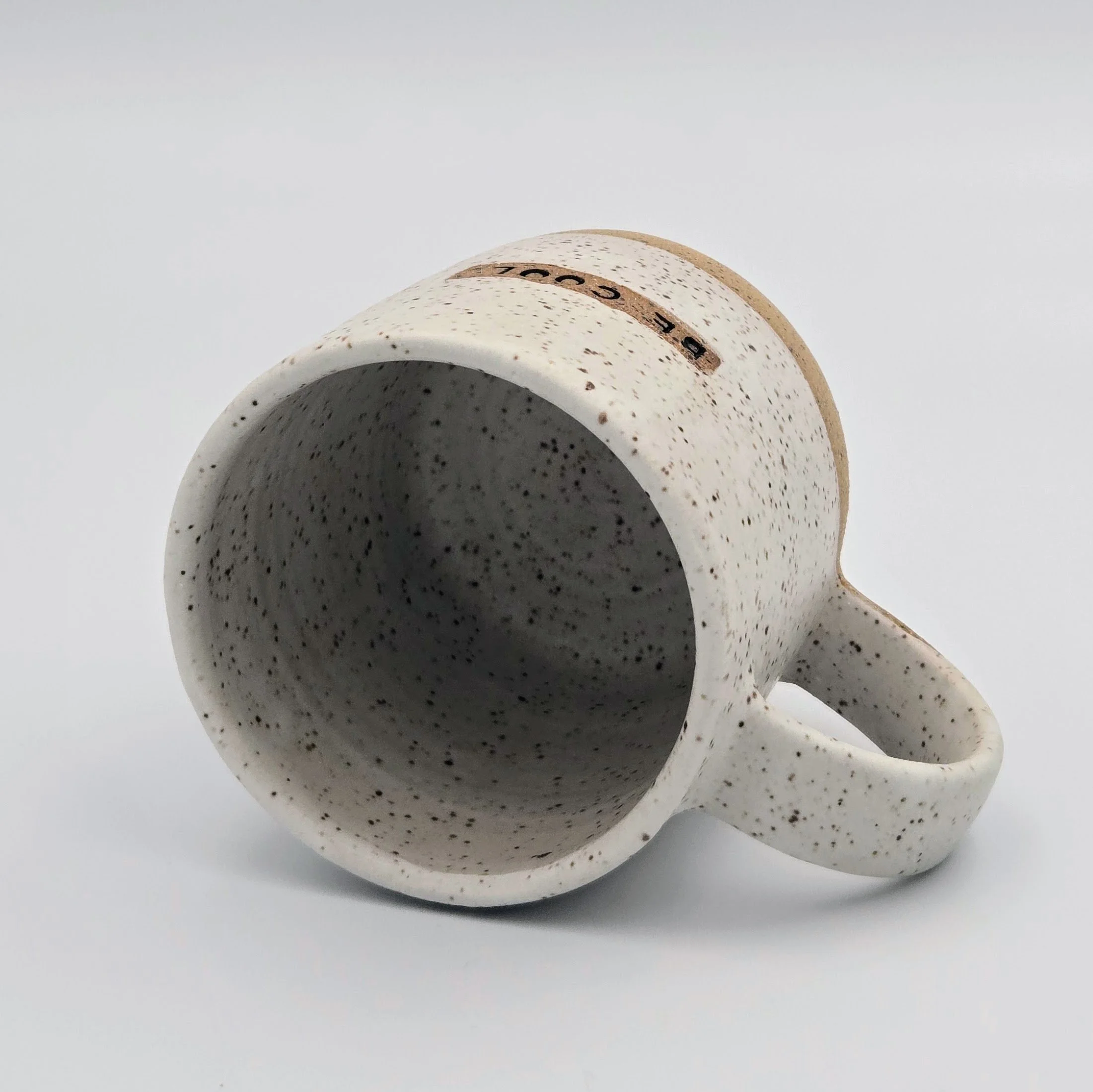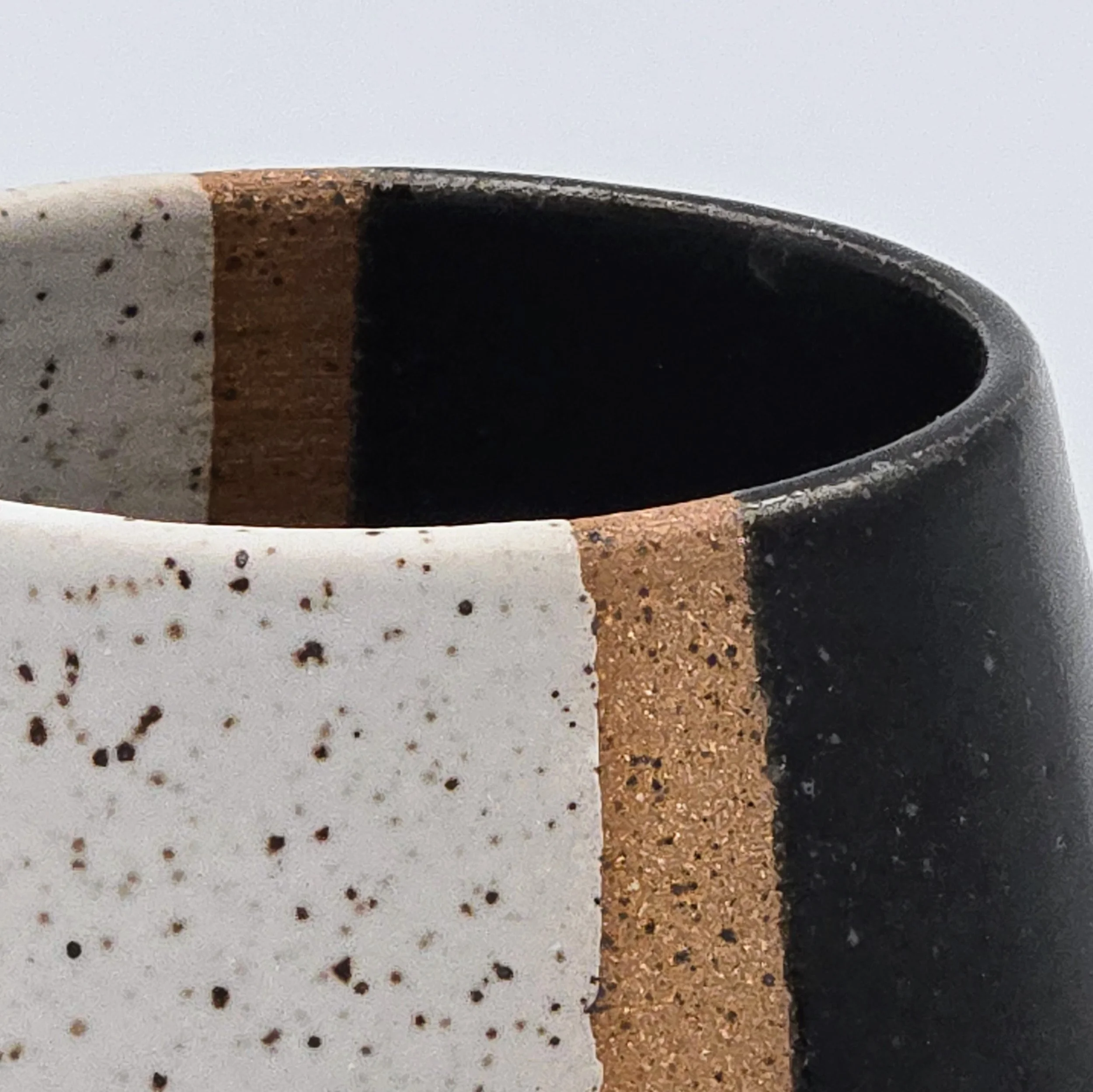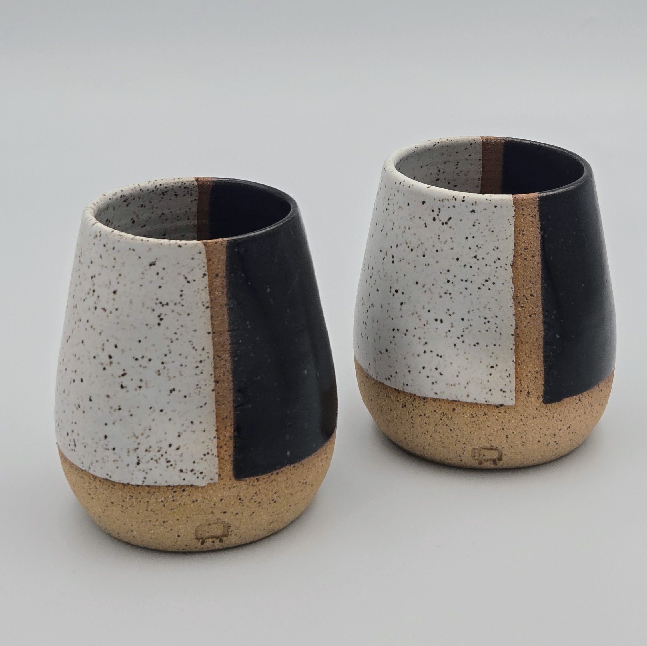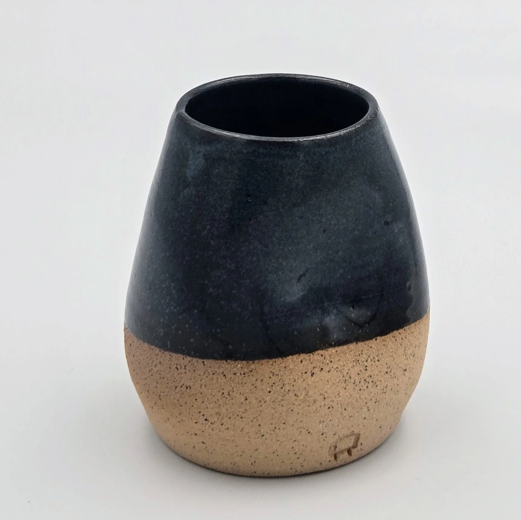 Stemless wine cup with thumbprint indent for grip. Saltstone glaze with exposed clay base. Holds 16oz - more than your standard pour. Approximately 3" diameter x 4" tall.