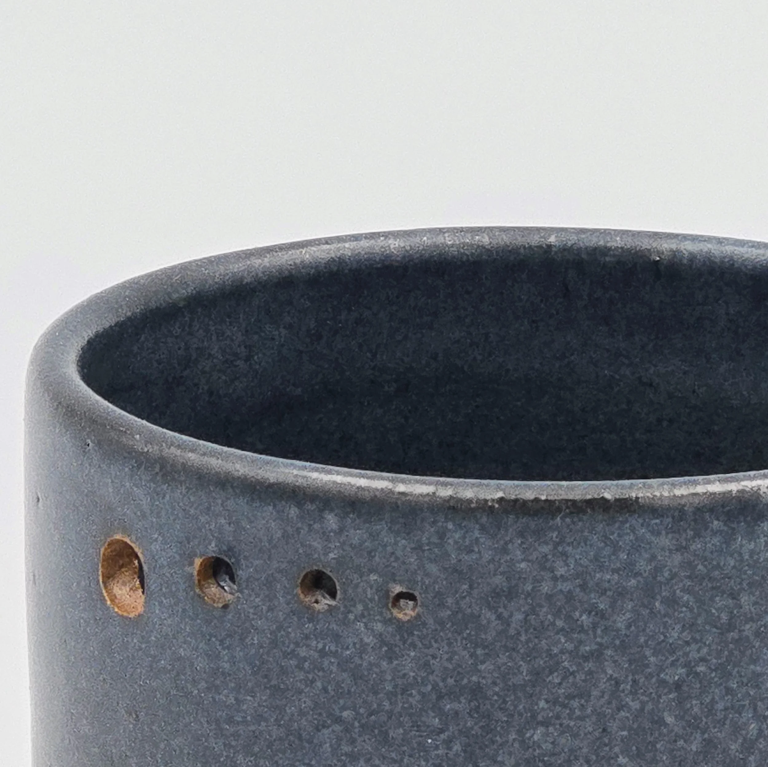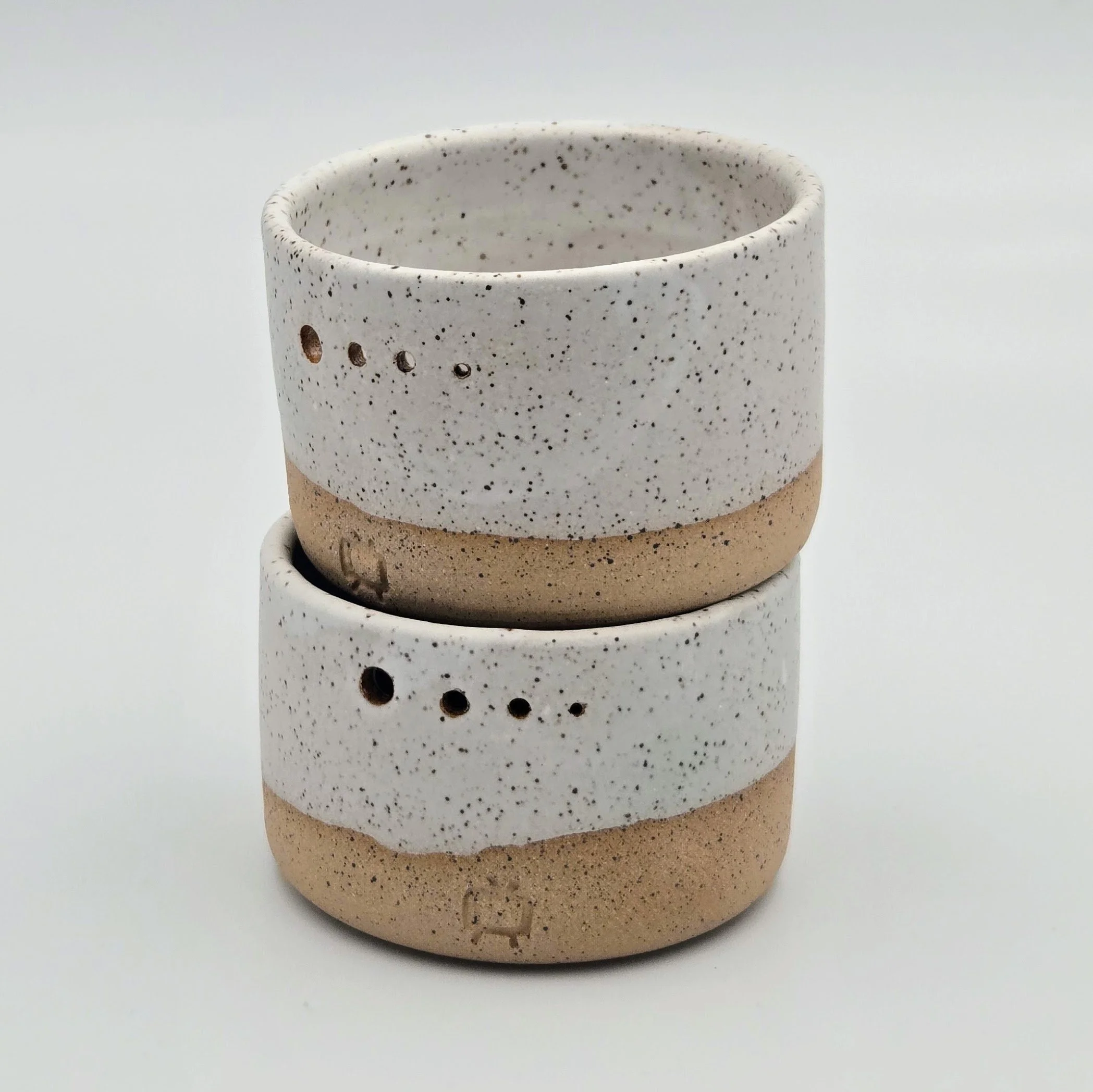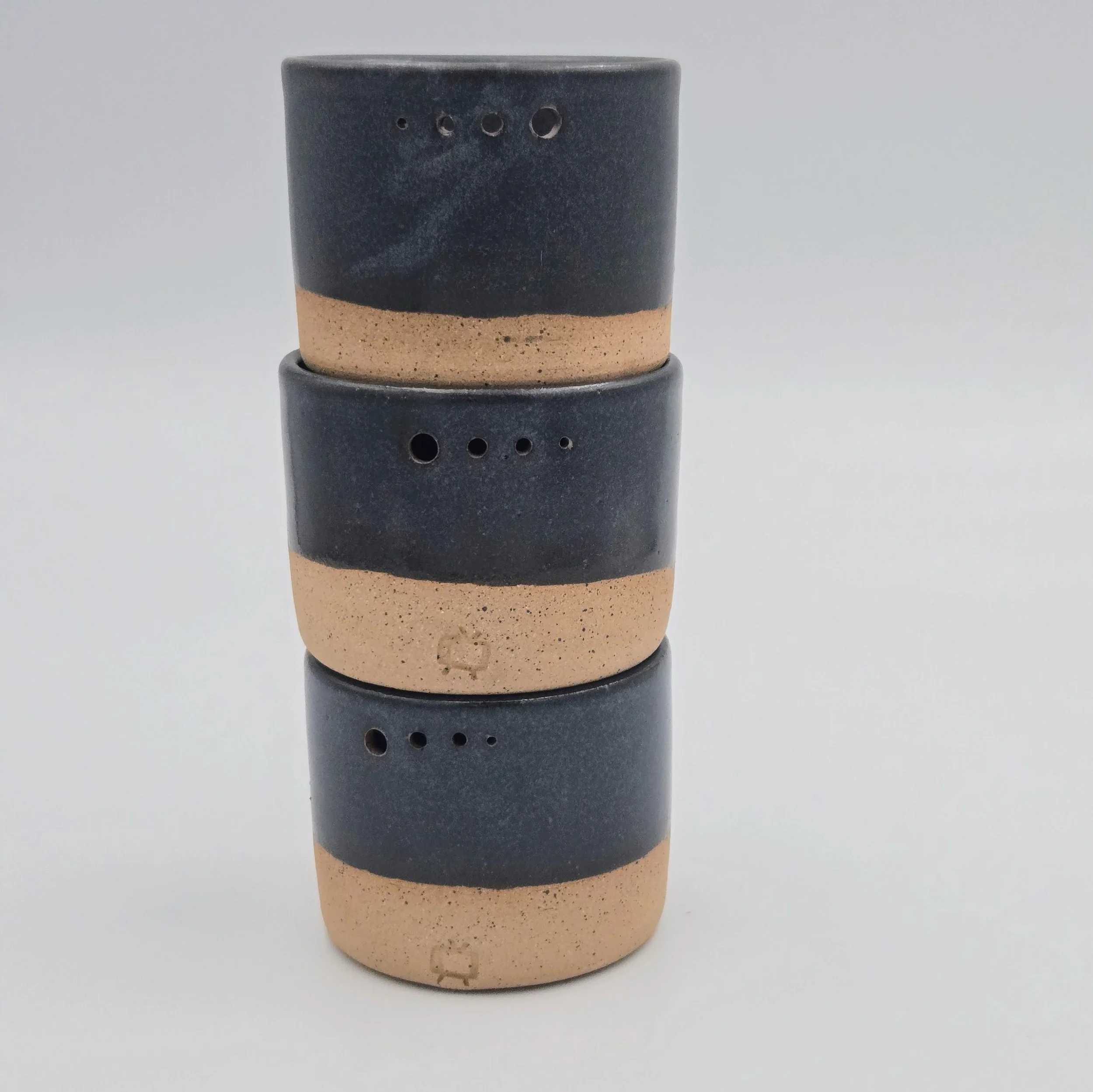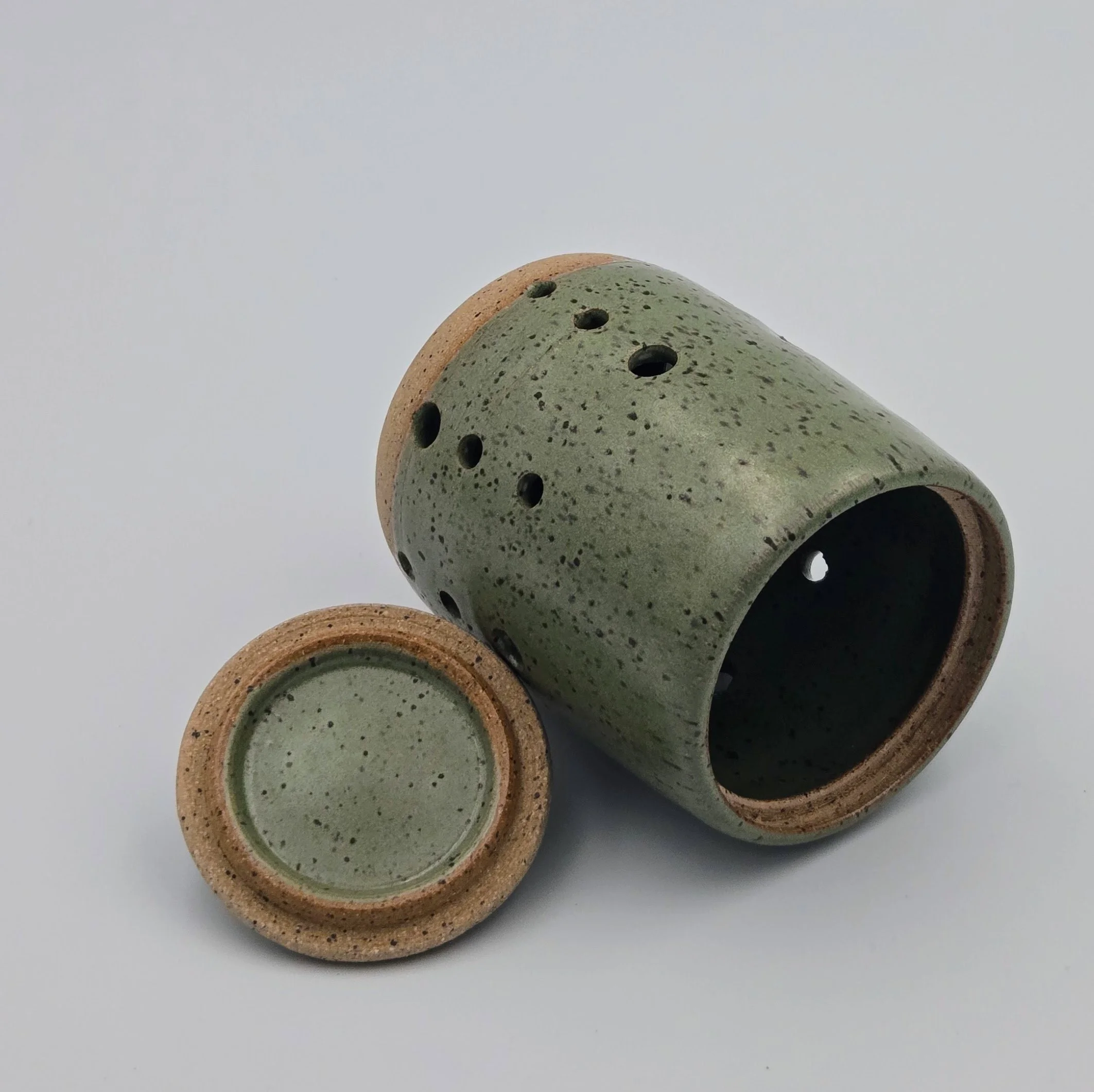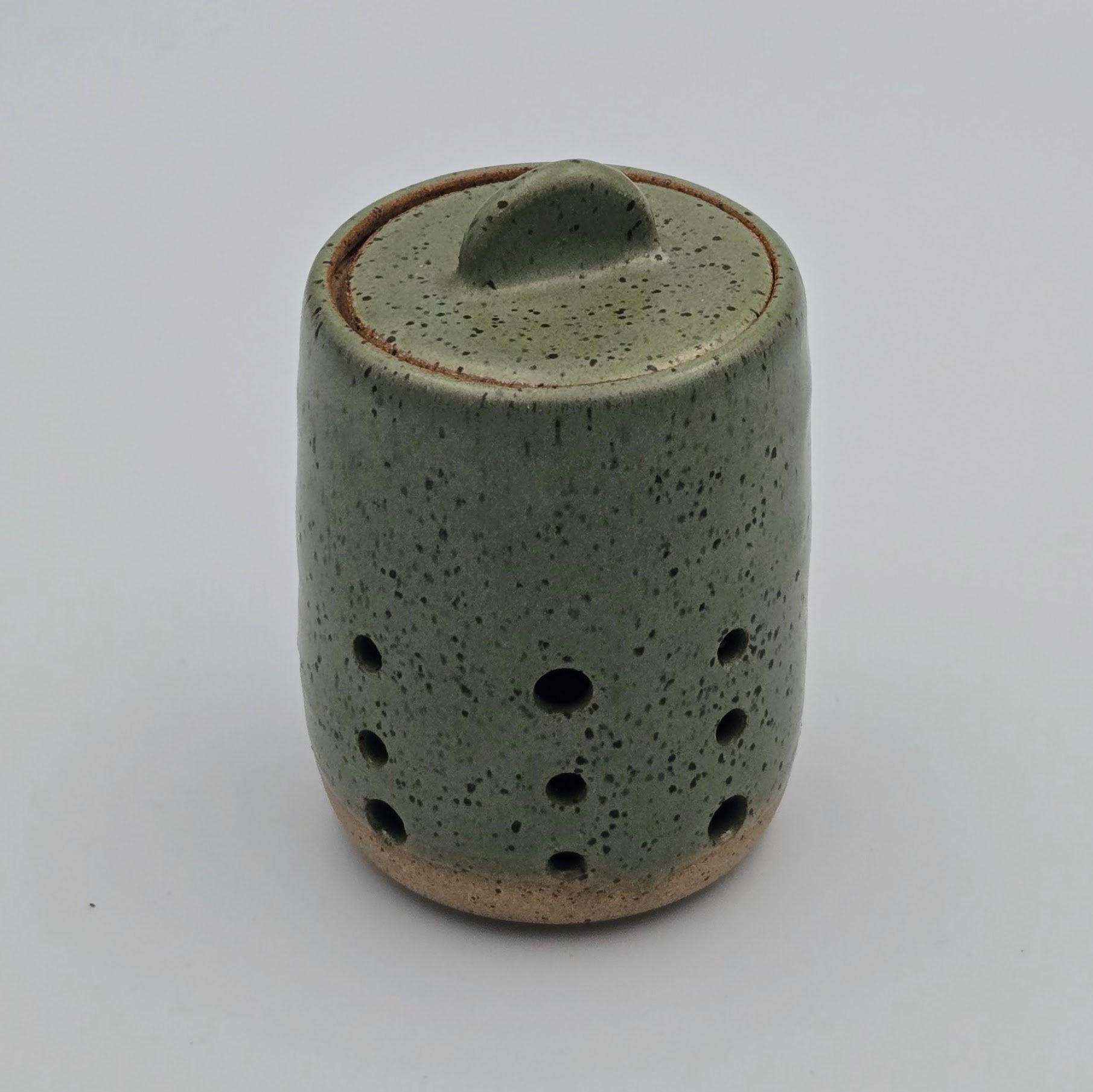 Wheel-thrown herb stripper with multiple hole sizes for stripping fresh herbs. Terrain glaze treatment with exposed clay base.